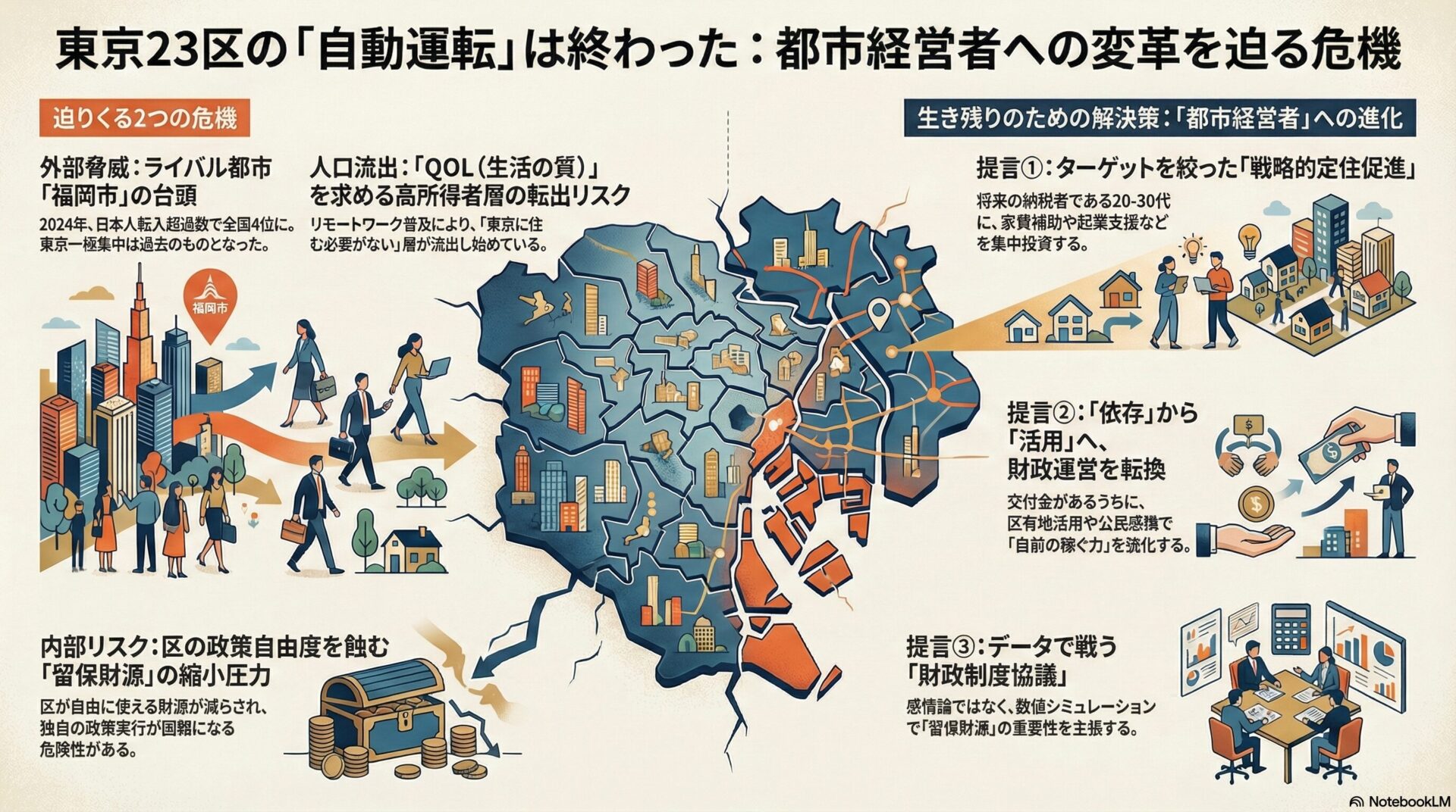 - 特別区内での「ゼロサムゲーム(近隣区からの奪い合い)」に終始してはいけません。視座を広げ、福岡市や大阪市といった広域拠点都市との比較において、東京の特別区が提供できる付加価値(圧倒的な情報の集積、多様なキャリアパス、文化的資産)を再定義し、発信する必要があります。具体的には、スタートアップ支援やクリエイティブ産業の誘致において、福岡市に負けないスピード感と支援体制を構築することが急務です。