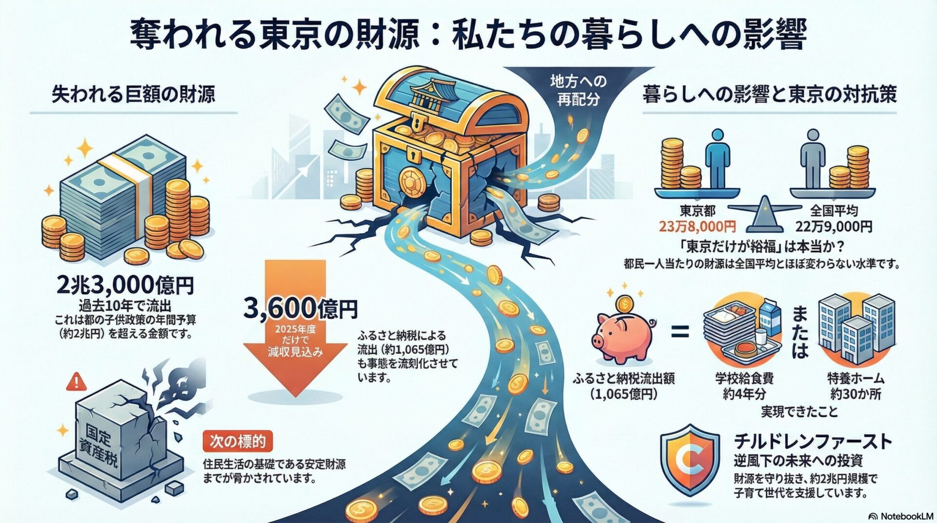 つまり、入口である「都の税収」が国によってカットされれば、当然、調整3税の総額(パイ)が縮小します。パイが小さくなれば、そこから配分される特別区への交付金も自動的に減少します。さらに、特別区民税(住民税)自体も「ふるさと納税」によって流出しており、特別区は「交付金の減少」と「独自財源の流出」というダブルパンチを受けているのが現状です。