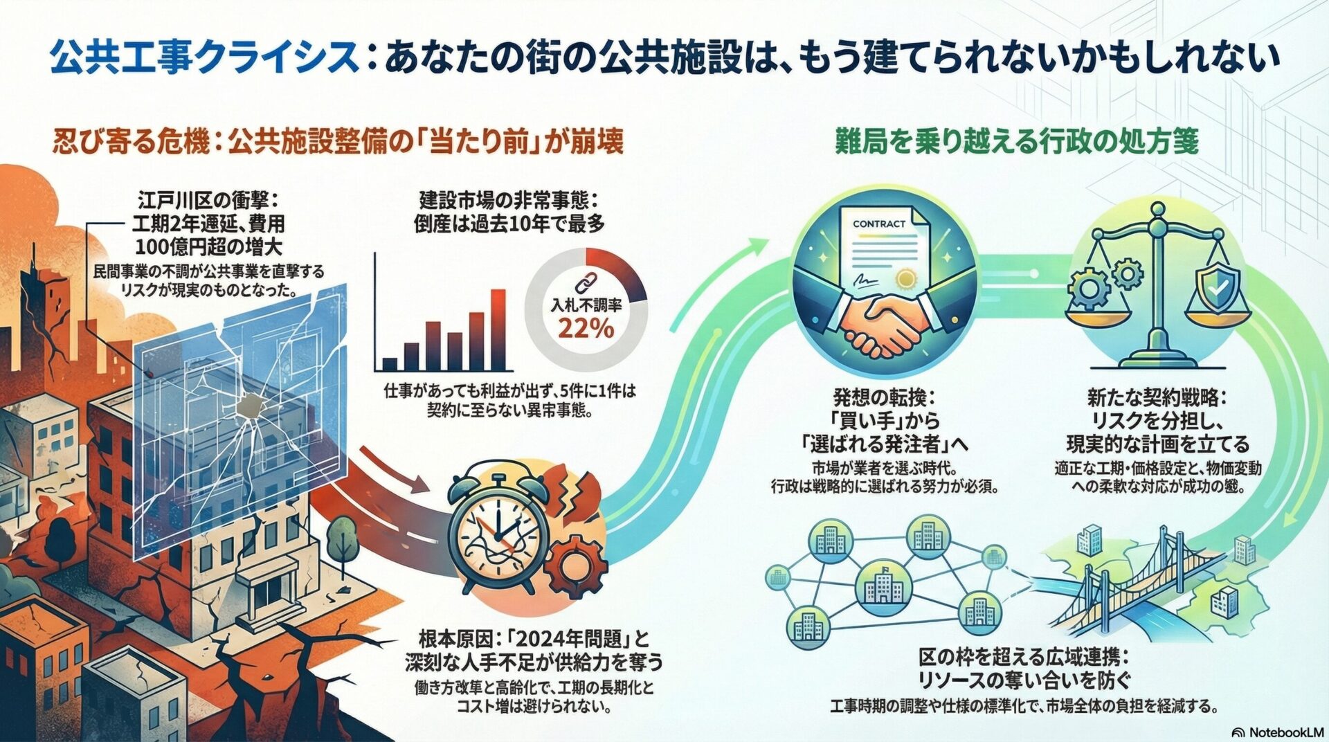江戸川区の事例は、首都圏の建設市場全体を覆う「構造的な供給制約」に起因しており、すべての自治体にとって共通の課題です。