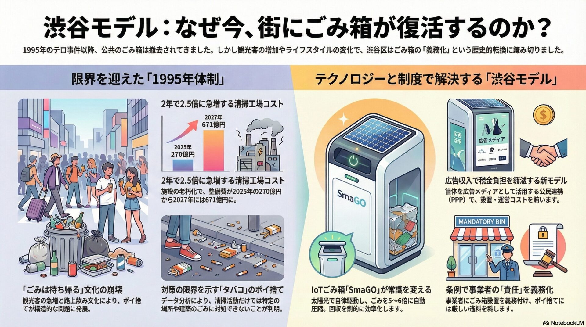 2025年12月10日、東京都渋谷区議会において可決された「ごみ箱設置義務化およびポイ捨て過料」に関する条例改正は、日本の地方自治体、とりわけ東京都特別区における都市衛生政策の歴史において、分水嶺となる極めて重要な意思決定であると言えます。この政策変更は、単なる一自治体の規則変更という範疇を超え、長らく日本の都市空間を支配してきた「公共空間からのごみ箱撤去」というドクトリン――ここではこれを「1995年体制」と呼称します――からの明確な脱却を意味し、新たな都市の社会的契約(ソーシャル・コントラクト)を提示するものだからです。