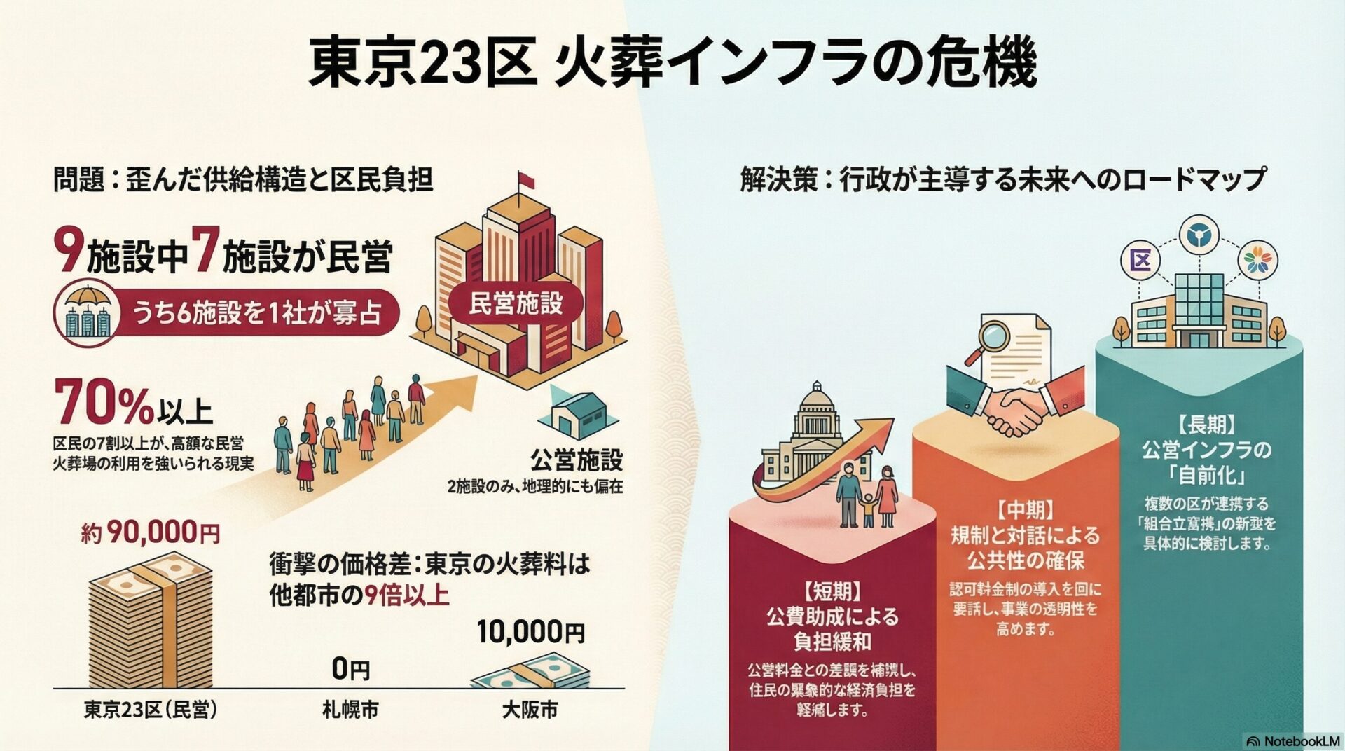 「民間に任せておけば税金を使わずに済む」というフリーライド戦略は、企業の寡占化によって破綻しました。 9万円という火葬料は住民にとっての「死の格差」そのものです。 今こそ、行政が積極的に介入し、公共インフラとしての火葬を住民の手に取り戻す好機です。