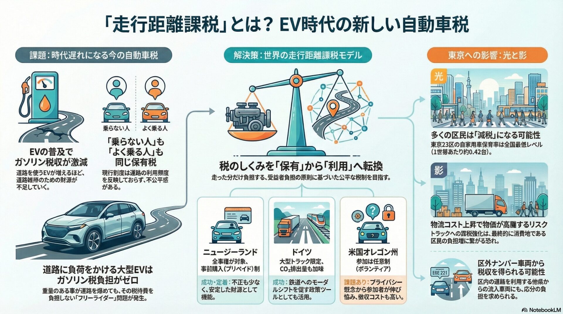 本記事では、走行距離課税をめぐる多角的な視点とデータを整理しました。第一に、税制改正の背景には「財源の危機」があり、2026年の環境性能割廃止がその議論を加速させています。第二に、海外事例からは、対象車種の選定やプライバシー配慮が制度の成否を分けることが明らかになりました。第三に、自動車保有率が低い特別区においては、この制度変革は区民負担の適正化や都市環境の改善という大きなチャンスになり得ます。