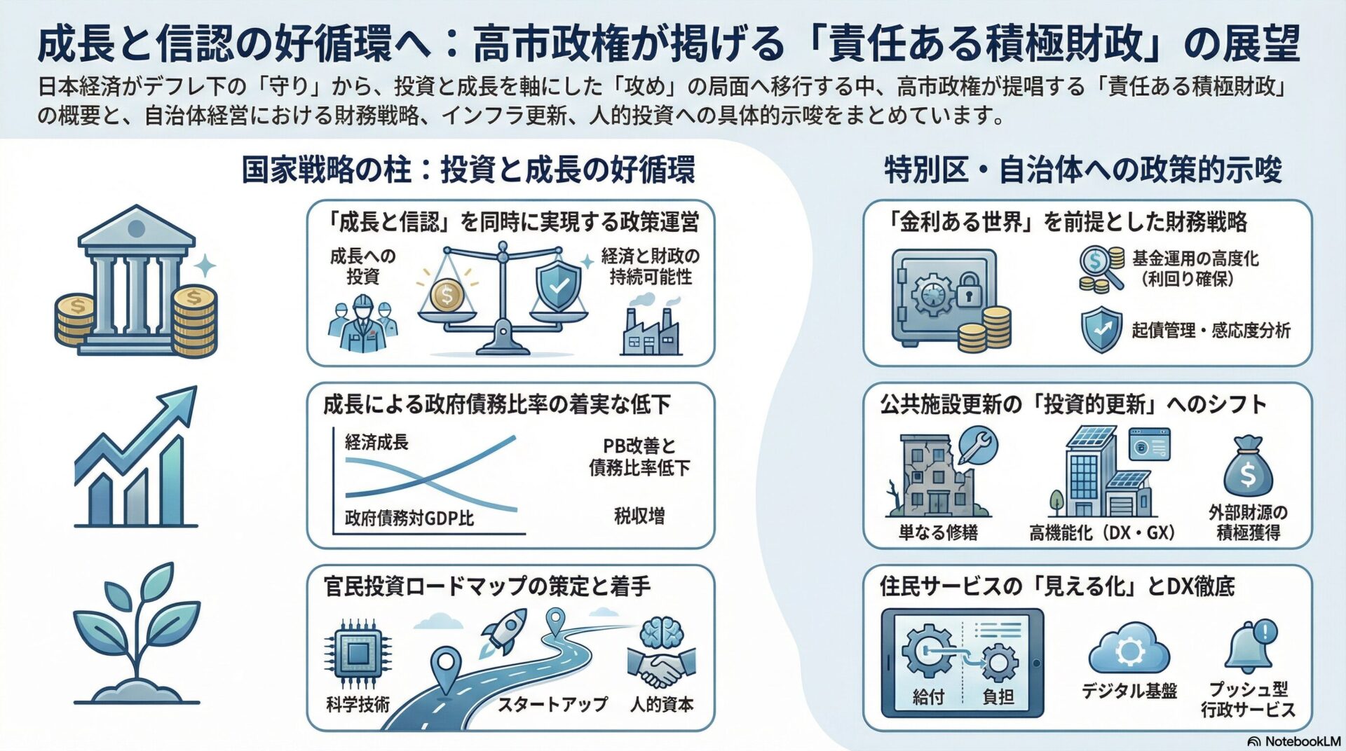 「強い経済」の恩恵を受ける層や子育て現役世代を呼び込むため、教育・保育・住環境への投資は「コスト」ではなく、将来の税収基盤を確保するための「成長投資」であると再定義し、優先順位を上げることが求められます。