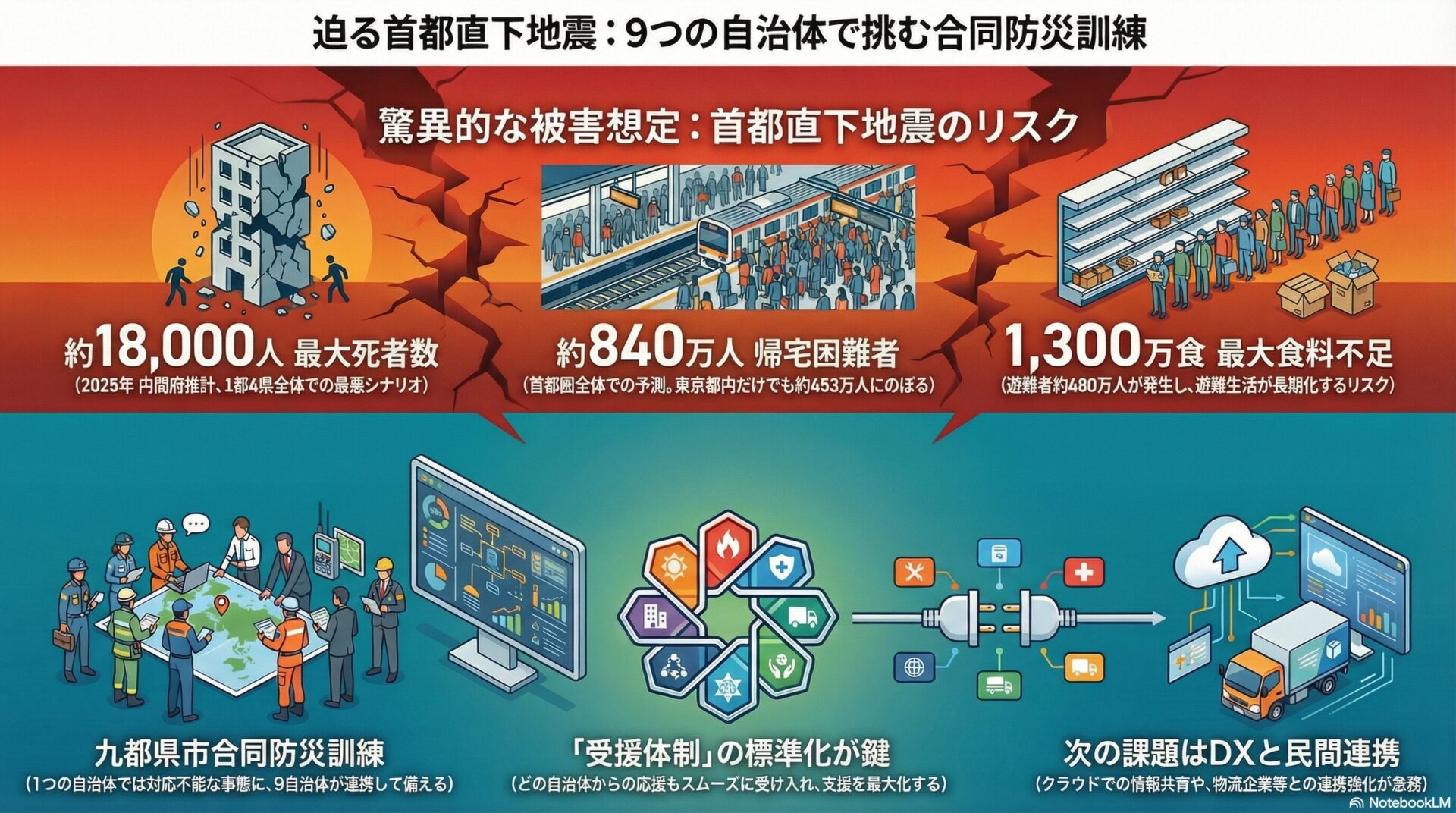 今回の第13回九都県市合同防災訓練・図上訓練は、単なる恒例行事ではなく、最新の被害想定に基づく極めて実戦的な検証の場です。人口と機能が極度に集中する首都圏において、広域的な連携はもはや選択肢ではなく、生存のための必須条件といえます。2025年末に公表された最新の被害想定が示す通り、死者数や建物被害は耐震化の進展により減少傾向にはあるものの、依然として「国難級」の被害が予測されています。特に450万人を超える帰宅困難者や1,300万食に及ぶ食料需要への対応は、一自治体の枠を越えた九都県市の結束なしには成し得ません。特別区の職員においては、本訓練を通じて得られた広域連携の知見を、各区の受援体制や民間連携の具体策へと昇華させることが期待されます。災害はいつ起こるかわかりません。しかし、平時からのこうした地道な訓練の積み重ねこそが、発災時に一人でも多くの命を救うための、最も確かな客観的根拠となるのです。