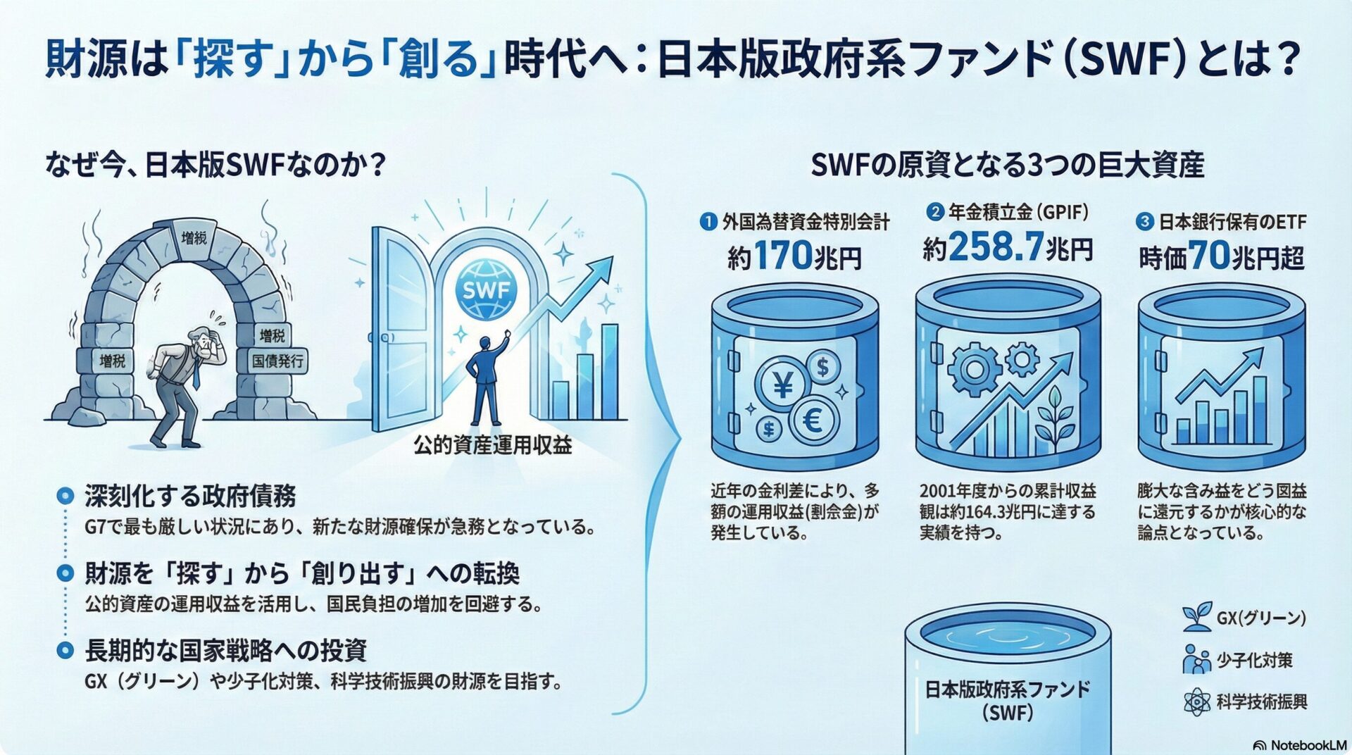 日本の政府債務は、2024年度末時点で普通国債残高だけで1,000兆円を超えており、社会保障費の増大が続く中で、新たな財源確保は急務です。これまでの議論は、支出の抑制か増税、あるいは赤字国債の発行に集約されてきました。しかし、日本版SWFは、政府がすでに保有しているが「活用」し切れていない資産に着目し、その運用収益を政策経費に充てることで、国民負担の増加を回避しつつ、GX(グリーントランスフォーメーション)や少子化対策、科学技術振興などの長期投資原資を捻出することを目指しています。