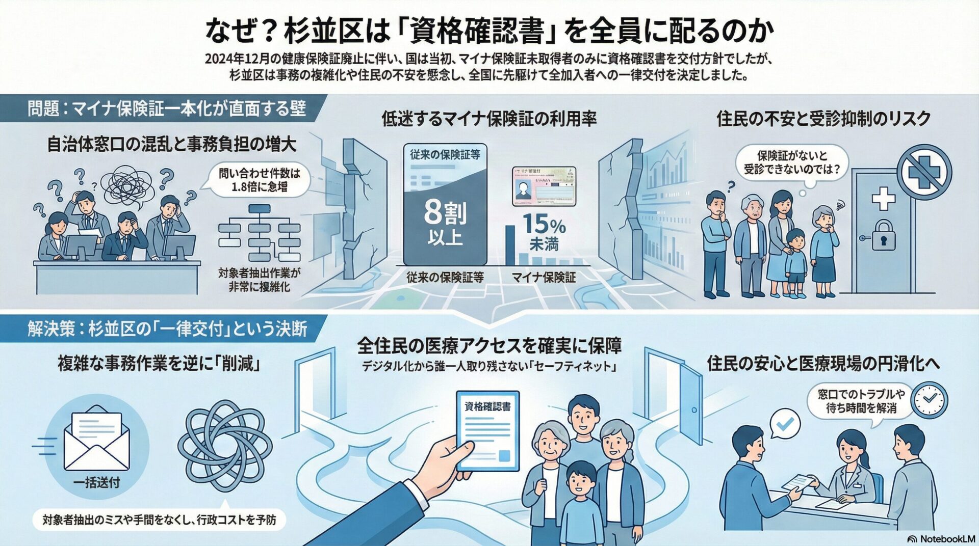 2026年1月、東京都杉並区議会は、国民健康保険の加入者全員に対して「資格確認書」を一律に交付することを求める陳情を採択しました。2024年12月の健康保険証廃止に伴い、国はマイナ保険証を保有しない層に対象を限定して交付する方針を堅持してきましたが、自治体現場では事務の複雑化や住民の受診抑制リスクが懸念されてきました。杉並区の今回の決定は、先行して一律交付を実施している世田谷区や渋谷区に続く動きであり、当初対象を絞っていた自治体の方針転換としては全国初の事例となります。本記事では、この決定が持つ行政上の意義、背景にある統計データ、そして今後の特別区における政策立案への示唆について、多角的な視点から整理します。