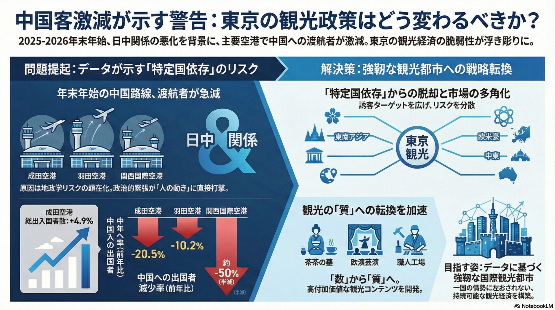 2026年年始の出入国統計が示した中国路線の急減は、東京都特別区の政策立案者にとって看過できない警鐘です。 成田で20.5%減、羽田で10.2%減、そして関空での半減という数字は、地政学的な緊張がいかに速やかに、かつ深刻に地域経済の血流を阻害するかを客観的なエビデンスとして突きつけました。 行政は、この事態を単なる一過性の現象として片付けるのではなく、特定の市場に依存しすぎない「観光ポートフォリオの多様化」と「高付加価値化」を加速させる機会と捉えるべきです。 同時に、区内事業者が受ける打撃を最小限に抑えるための機動的な支援策と、政治情勢に左右されない都市としての安全・安心な魅力を世界へ発信し続ける一貫した姿勢が求められます。 今後の観光政策立案においては、こうした客観的な統計データを基に、常に変動する国際情勢を織り込んだ「地政学リスク対応型」の都市経営を実現することが、特別区の持続可能な発展に繋がります。