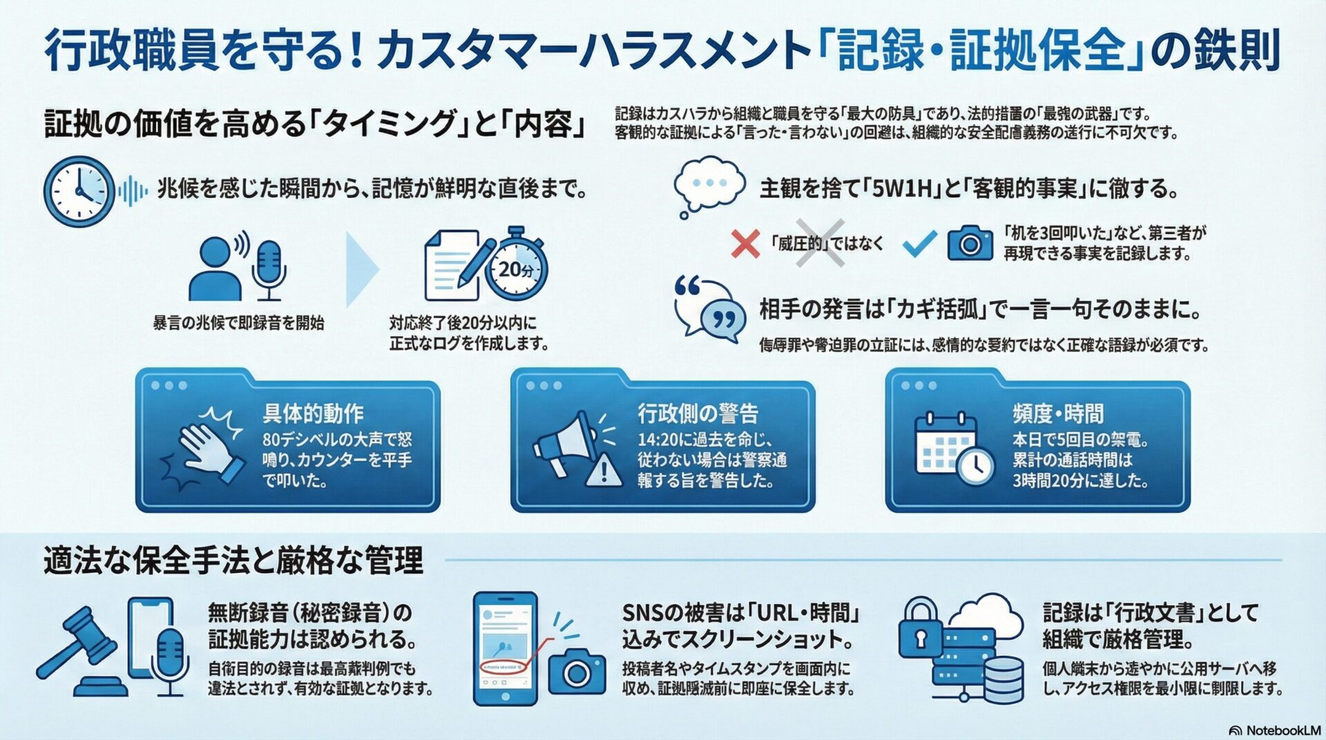 東京都カスタマー・ハラスメント防止条例が施行される中、「税金を払っている」と凄み、過剰な要求や暴言を繰り返す行為は明確な迷惑行為と位置づけられます。一人で抱え込まず、複数人での対応や管理職への引き継ぎ、悪質な場合は警察との連携など、組織全体で毅然とした措置をとる体制を整えてください。